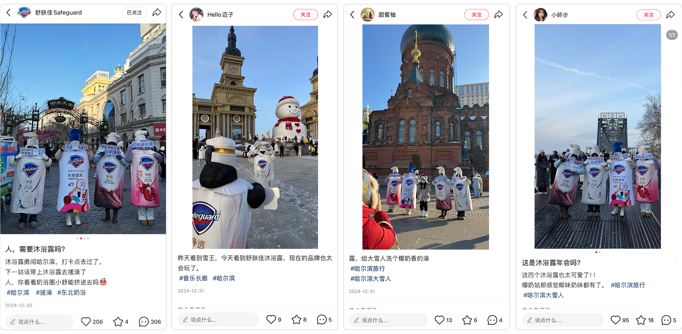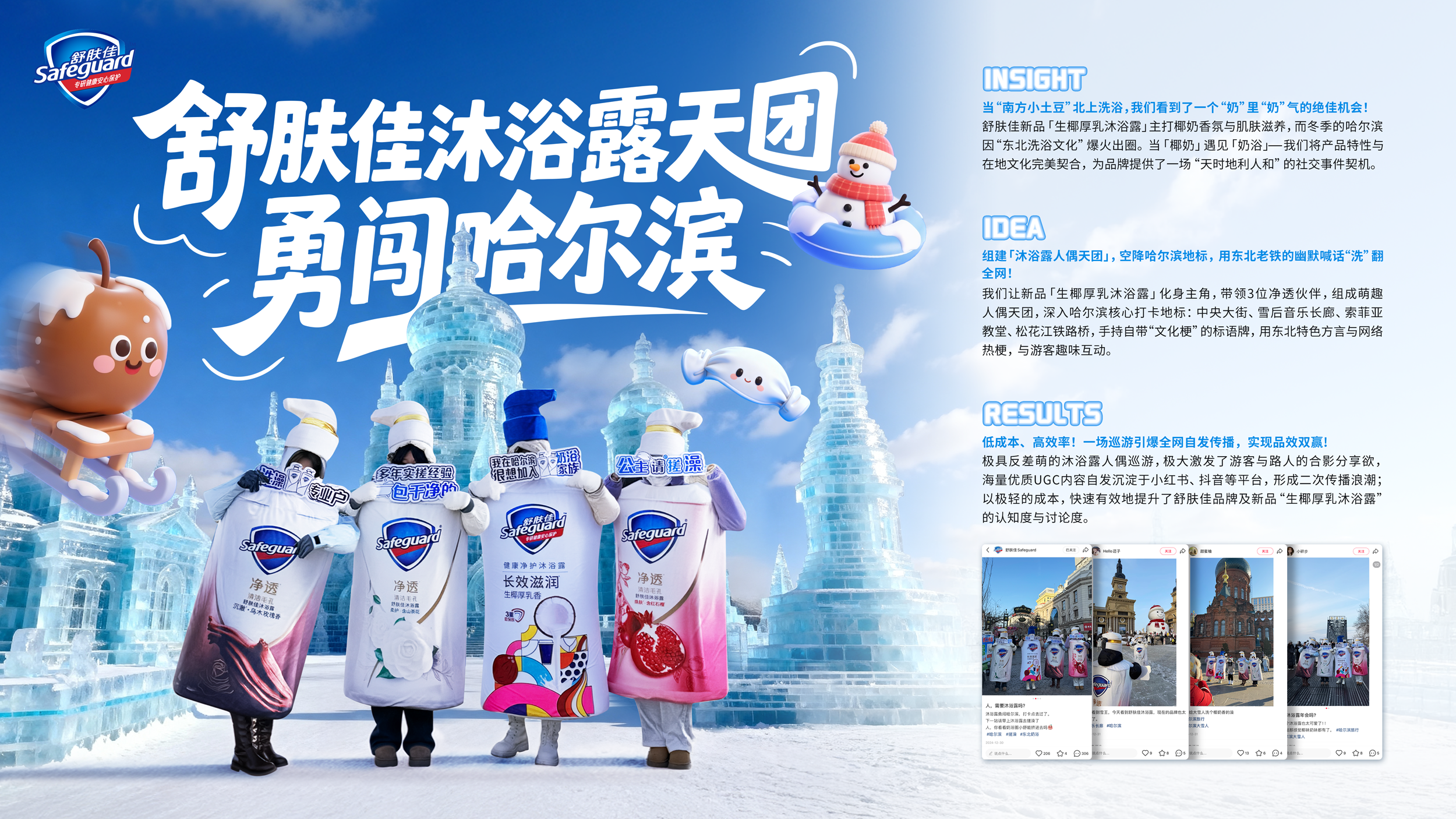 舒肤佳组建了一支特别的"沐浴露人偶小队",包括「生椰厚乳沐浴露」和3个"净透伙伴",在哈尔滨多个热门地标展开巡游。