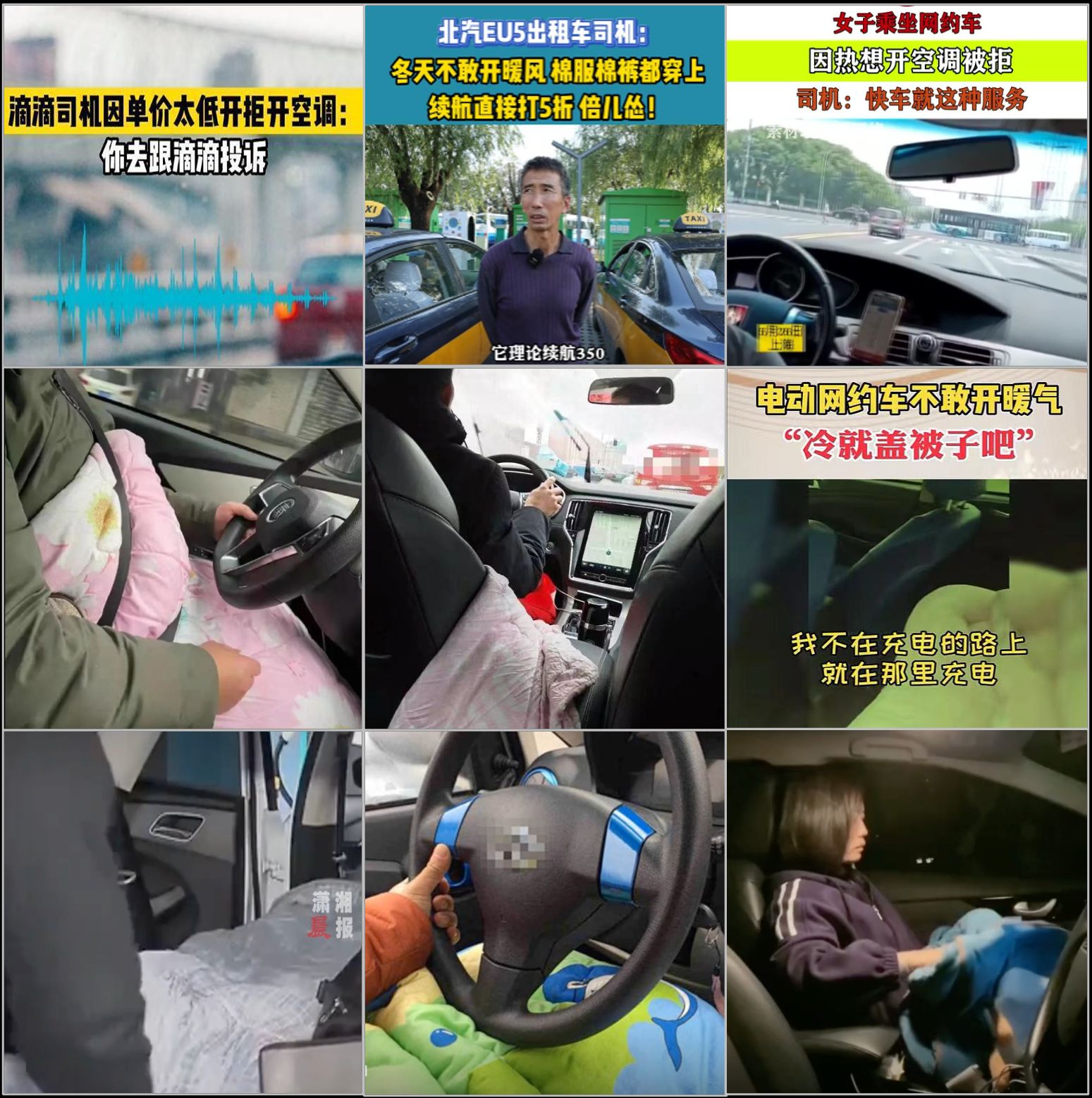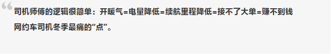 新能源电车是网约车的主流,电车到了冬季掉电特别快,他们担心续航不敢开暖空调,宁可穿棉袄盖被子,甚至引发乘客的投诉(讲真,小编也打到过很多次这样的冰柜车)。