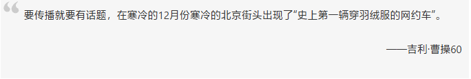 为了尽可能触及核心司机圈层,我们将史上第一辆“羽绒服网约车”的首次出场,日期选在了寒流来袭气温最低降雪最猛的12月,地址选在网约车司机接单量最大的CBD和景点,让“羽绒车”尽可能暖到最多的冬天跑车的司机师傅。