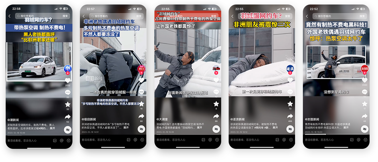 在这里,好内容的第一个标准“司机会看吗?” 对于每天都要刷抖音的司机来说,“北京街头惊现羽绒服网约车”只能让他停留3秒,但“北京街头惊现羽绒服网约车 震惊国外友人” 却让他多停留10秒!