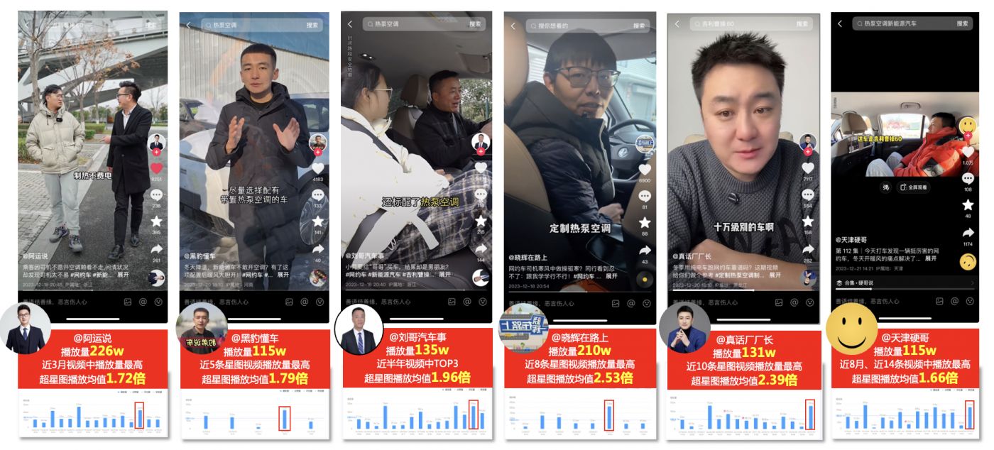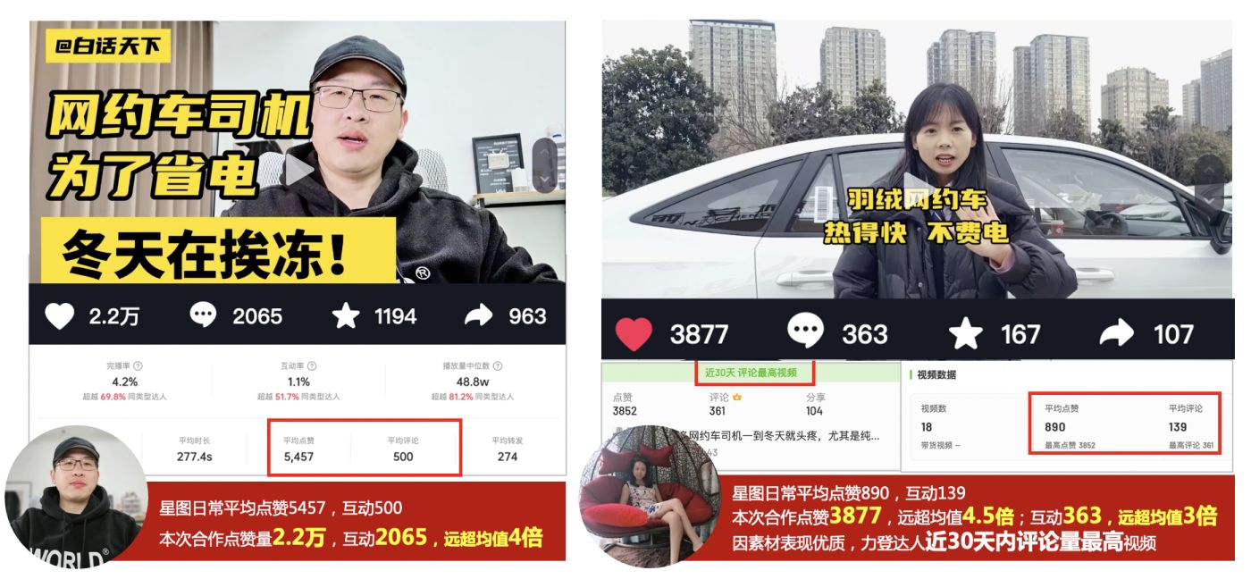 好内容的第二个标准“司机会转发吗?会评论吗”,司机只相信司机的话,最信老司机。为此X-MEN挖掘了200+真实发声的老司机KOC外加20+汽车与生活领域KOL,形成话题矩阵,真正达成渗透式精准传播,带来5063万总曝光量以及25万总互动量,助推多条视频冲榜话题热度前列,#定制热泵空调制热不费电#话题突破4100万。