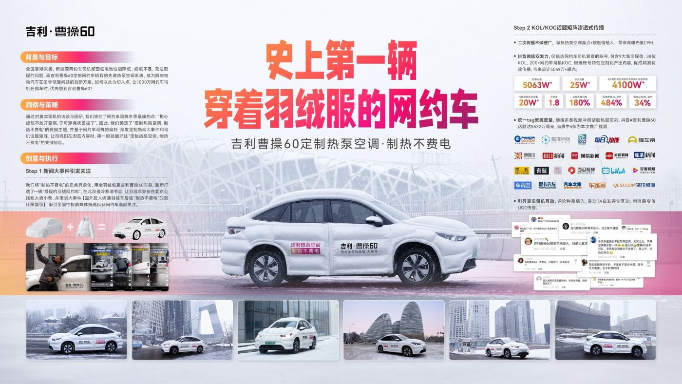 吉利·曹操60就是一款专为网约车司机设计的定制车,在诸多功能中,其标配的热泵空调可以做到制热不费电,这在10万元级别的轿车中是绝无仅有的配置。作为一款认知度不高的车型,如何让1000万网约车司机购车时优先想到曹操60?我们决定以定制的热泵空调作为切入点,在司机圈层里的制造话题事件: